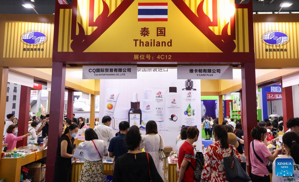 | Pengunjung melihat produk-produk dari Thailand pada Ekspo Produk Pengguna Antarabangsa China (CICPE) keempat di Haikou, ibu kota Provinsi Hainan, di selatan China. Berlangsung dari 13 hingga 18 April, ekspo yang bertemakan “Kongsi Peluang Terbuka, Bersama Bina Kehidupan Lebih Baik” itu menarik penyertaan banyak syarikat dari negara-negara terlibat Inisiatif Jalur dan Laluan (BRI). (Xinhua/Yang Guanyu) |