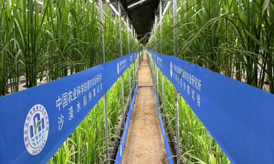 | Padi pembiakan cepat ditanam di rumah hijau padang pasir di Hotan, Wilayah Autonomi Uygur Xinjiang, dalam tempoh percubaan. (Foto/Institut Pertanian Bandar, Akademi Sains Pertanian China) |