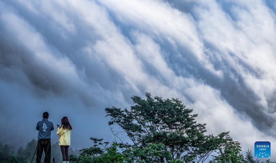 Pelancong menikmati pemandangan awan yang seakan-akan mengalir menuruni Gunung Jinfo di Chongqing, barat daya China, 13 Mei 2024. (Xinhua/Qu Mingbin)
