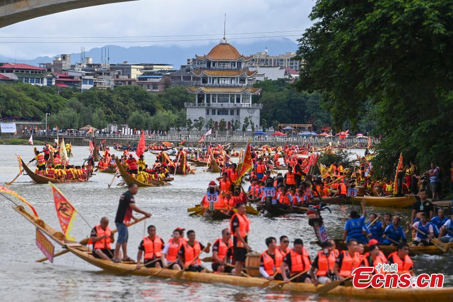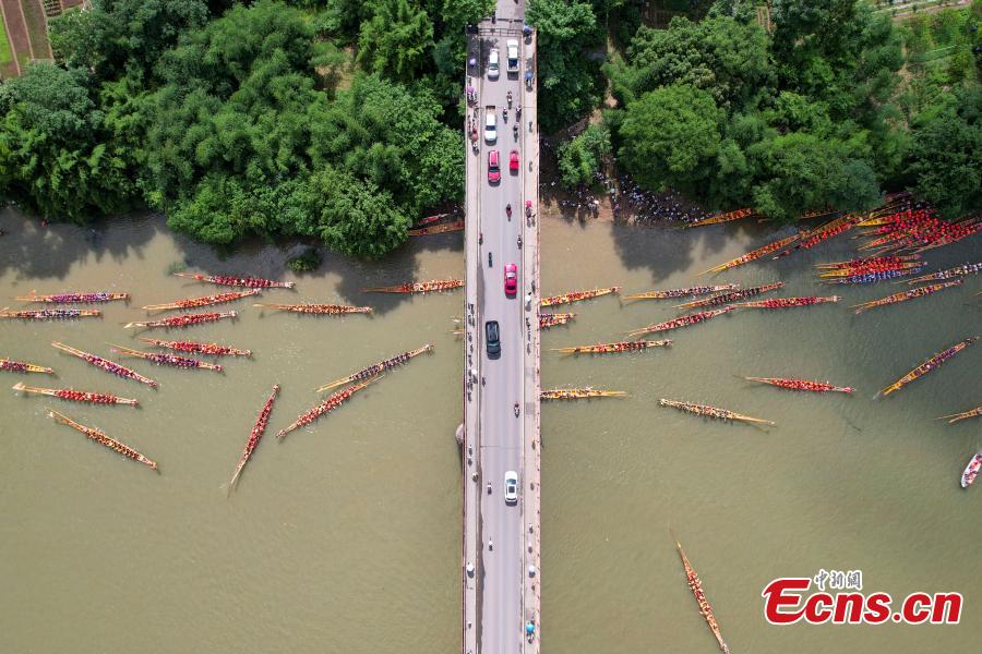 Perarakan perahu naga di Sungai Xiaoshui sempena menyambut Festival Perahu Naga di Kaunti Dongxian, Bandar Yongzhou, Provinsi Hunan, di tengah China pada 2 Jun 2024. (China News Service/Yang Huafeng)