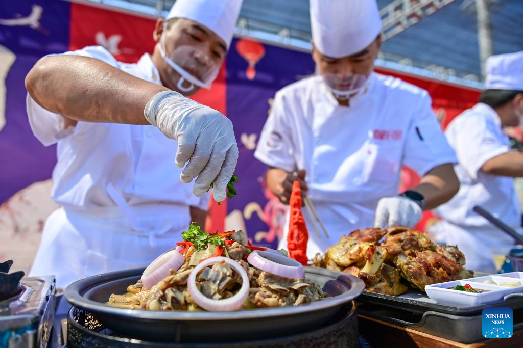 | Tukang masak menyediakan hidangan semasa pertandingan memasak kambing di wilayah Tacheng, kaunti Yumin, Wilayah Autonomi Uygur Xinjiang, di barat laut China pada 2 Jun 2024. (Xinhua/Ding Lei) |