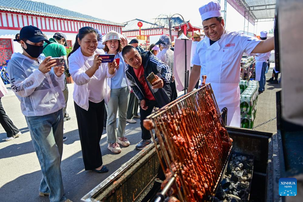 | Orang ramai mengambil foto hidangan kambing semasa pertandingan memasak kambing di wilayah Tacheng, kaunti Yumin, Wilayah Autonomi Uygur Xinjiang, di barat laut China pada 2 Jun 2024. (Xinhua/Ding Lei) |