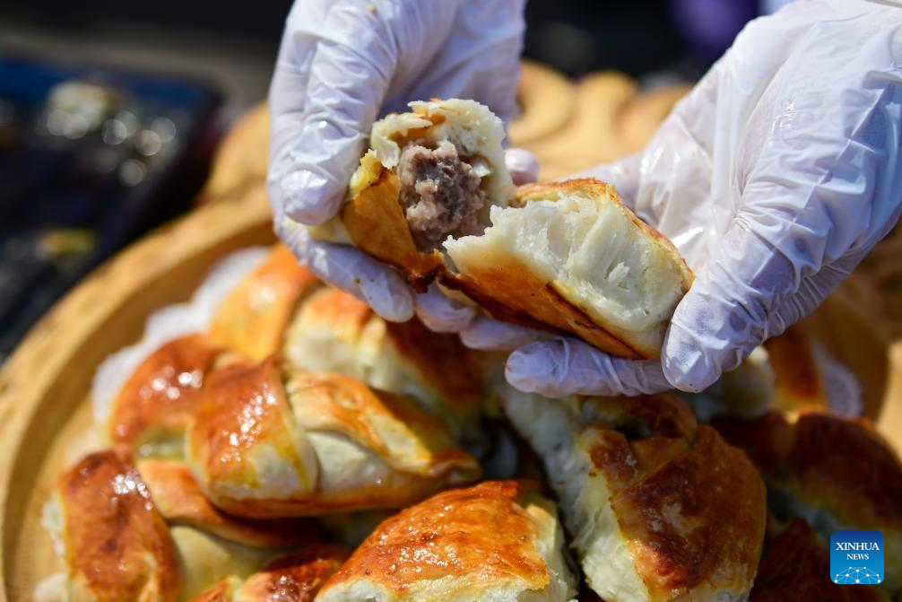| Seorang tukang masak menunjukkan ban panggang semasa pertandingan memasak kambing di wilayah Tacheng, kaunti Yumin, Wilayah Autonomi Uygur Xinjiang, di barat laut China pada 2 Jun 2024. (Xinhua/Ding Lei) |