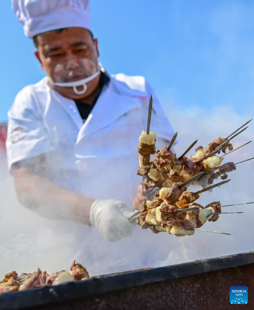 | Seorang tukang masak memanggang kebab semasa pertandingan memasak kambing di wilayah Tacheng, kaunti Yumin, Wilayah Autonomi Uygur Xinjiang, di barat laut China pada 2 Jun 2024. (Xinhua/Ding Lei) |