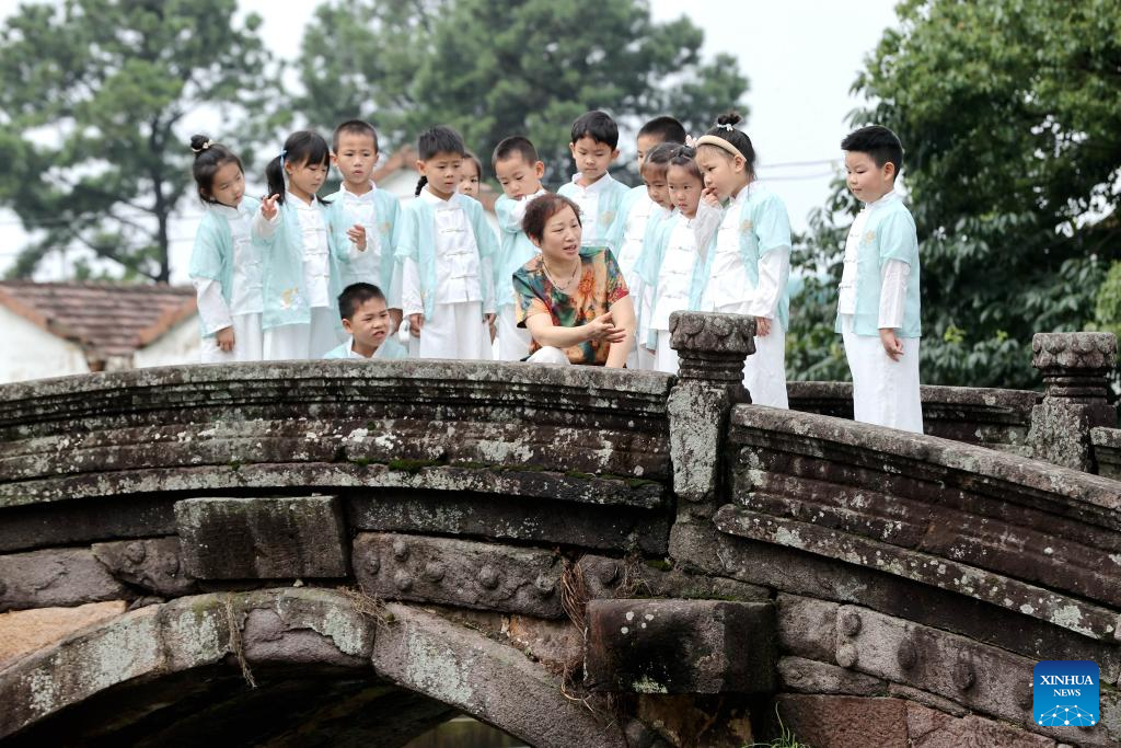 | Seorang sukarelawan menceritakan sejarah Jambatan Wanshan kepada sekumpulan pelawat muda di Kampung Shebei di Pekan Xin'an, Kaunti Deqing, provinsi Zhejiang, di timur China pada 26 Jun 2024. Kaunti Deqing adalah asal usul kepada tujuh jambatan batu purba yang disenaraikan sebagai tapak warisan budaya utama di bawah perlindungan peringkat negeri. Beberapa tahun mutakhir ini, kaunti ini bergiat aktif dalam perlindungan dan pengubahsuaian jambatan batu purba, sambil menggalakkan penyepaduan sumber warisannya dengan pelancongan budaya dan penyelidikan. (Foto Xie Shangguo/Xinhua) |
