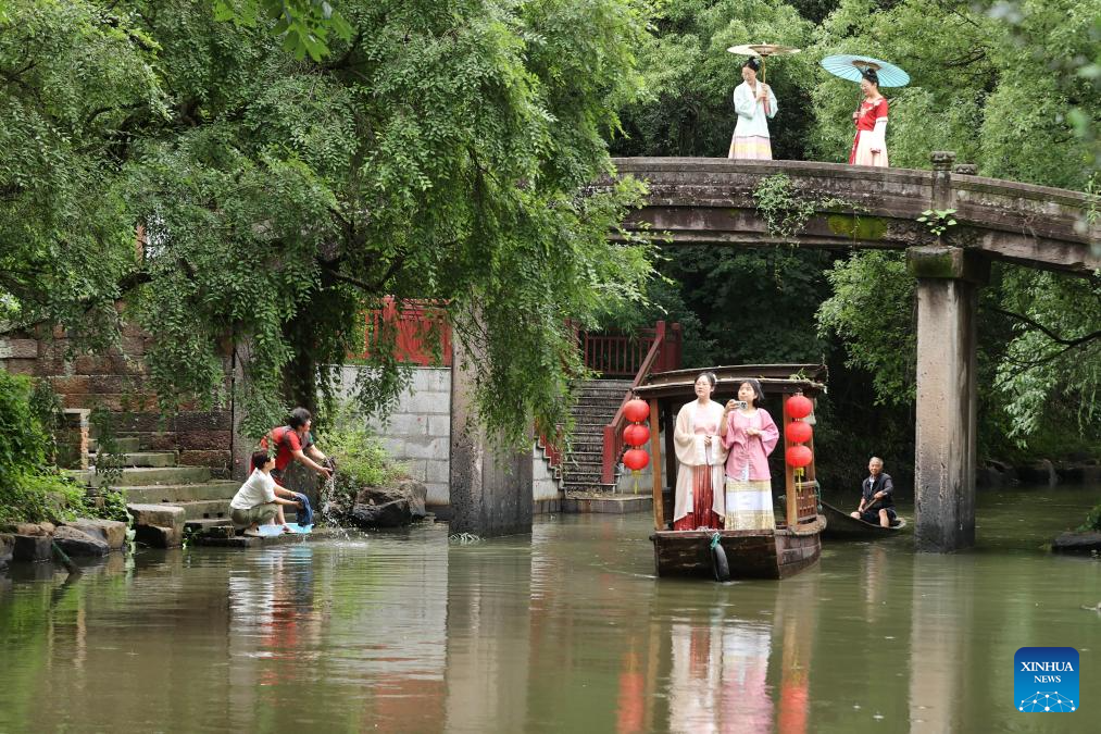 | Orang ramai berjalan di Jambatan Wanshan di Kampung Shebei di Pekan Xin'an, Kaunti Deqing, provinsi Zhejiang, di timur China pada 26 Jun 2024. Kaunti Deqing adalah asal usul kepada tujuh jambatan batu purba yang disenaraikan sebagai tapak warisan budaya utama di bawah perlindungan peringkat negeri. Beberapa tahun mutakhir ini, kaunti ini bergiat aktif dalam perlindungan dan pengubahsuaian jambatan batu purba, sambil menggalakkan penyepaduan sumber warisannya dengan pelancongan budaya dan penyelidikan. (Foto Xie Shangguo/Xinhua) |