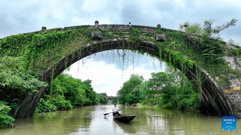 | Foto dron yang diambil pada 26 Jun 2024 ini menunjukkan seorang lelaki menaiki bot di bawah Jambatan Shouchang di Kampung Erdu di Kaunti Deqing, provinsi Zhejiang, di timur China. Kaunti Deqing adalah asal usul kepada tujuh jambatan batu purba yang disenaraikan sebagai tapak warisan budaya utama di bawah perlindungan peringkat negeri. Beberapa tahun mutakhir ini, kaunti ini bergiat aktif dalam perlindungan dan pengubahsuaian jambatan batu purba, sambil menggalakkan penyepaduan sumber warisannya dengan pelancongan budaya dan penyelidikan. (Foto Xie Shangguo/Xinhua) |