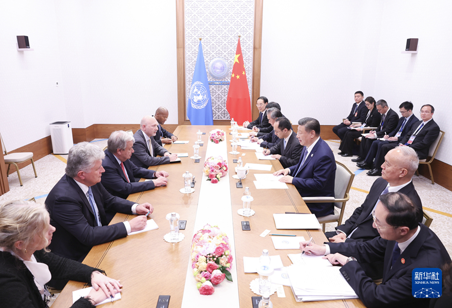 Presiden China Xi Jinping bertemu dengan Setiausaha Agung Pertubuhan Bangsa-Bangsa Bersatu (PBB) Antonio Guterres sempena sidang kemuncak Pertubuhan Kerjasama Shanghai (SCO) di Astana, Kazakhstan pada petang Khamis.