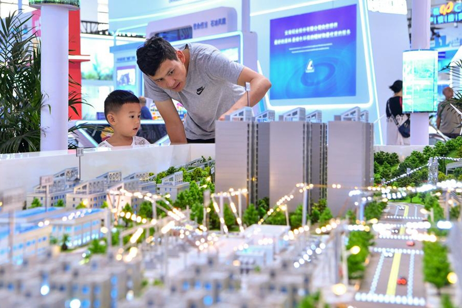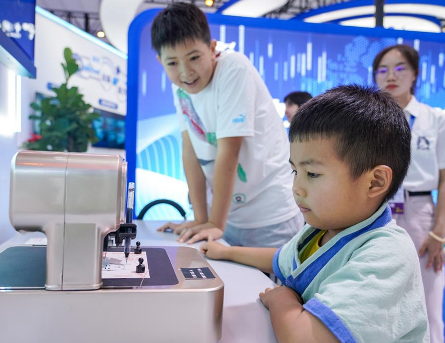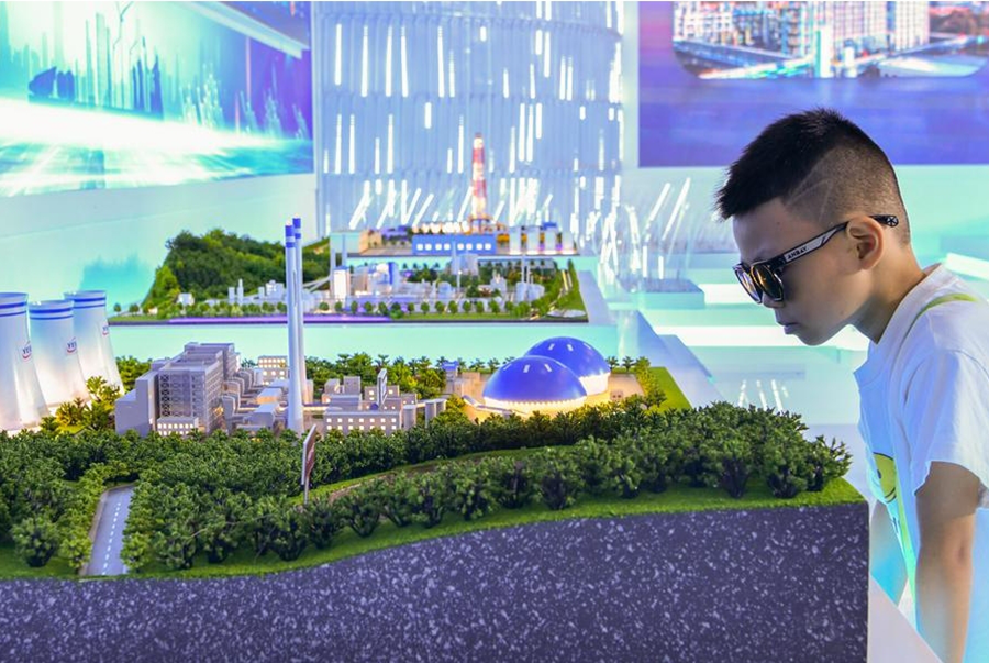 | Seorang kanak-kanak melihat meja pasir kilang tenaga hijau semasa Ekspo China-Asia Selatan yang ke-8 di Kunming, provinsi Yunnan, barat daya China pada 25 Julai 2024. (Xinhua/Peng Yikai) |