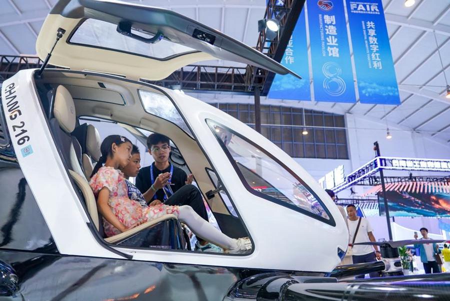 | Pengunjung mempelajari tentang kenderaan udara autonomi yang membawa penumpang semasa Ekspo China-Asia Selatan yang ke-8 di Kunming, provinsi Yunnan, barat daya China pada 25 Julai 2024. (Xinhua/Wang Jingyi) |
