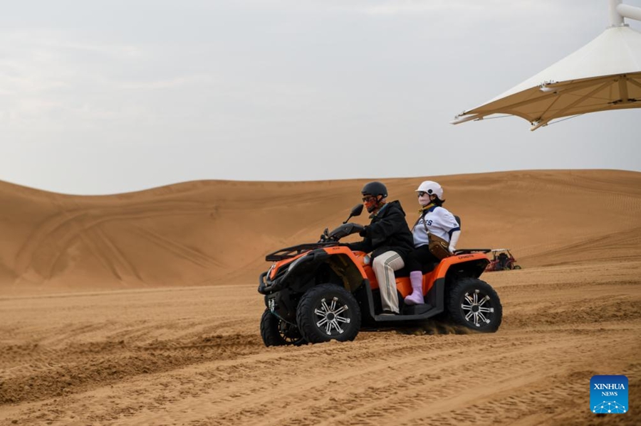 | Pelancong menaiki motorsikal di kawasan pemandangan Padang Pasir Yinkentala di Dalad Banner, Wilayah Autonomi Mongolia Dalam China pada 31 Julai 2024.(Xinhua/Li Zhipeng) |