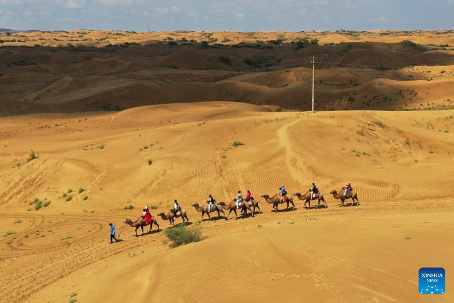 | Foto yang diambil menggunakan dron ini memperlihatkan pelancong sedang menunggang unta di kawasan pemandangan Padang Pasir Yinkentala di Dalad Banner, Wilayah Autonomi Mongolia Dalam di utara China pada 31 Julai 2024. (Xinhua/Li Zhipeng). |