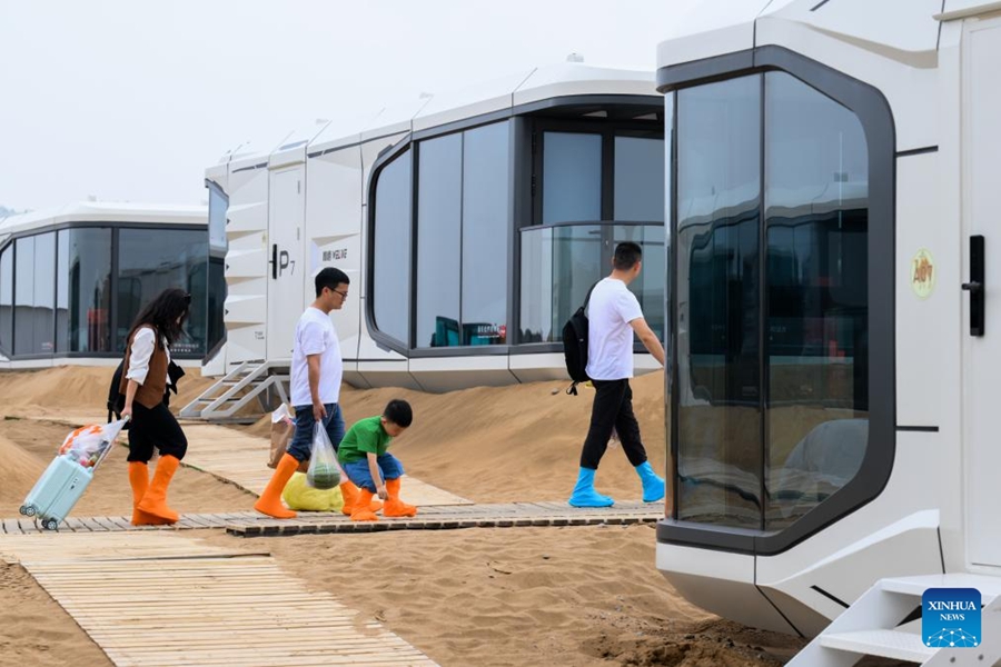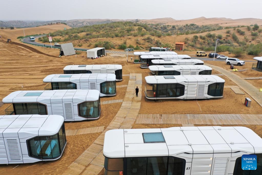 | Pelancong berjalan masuk ke kem kapsul di kawasan pemandangan Padang Pasir Yinkentala di Dalad Banner, Wilayah Autonomi Mongolia Dalam China. (Xinhua/Li Zhipeng) |