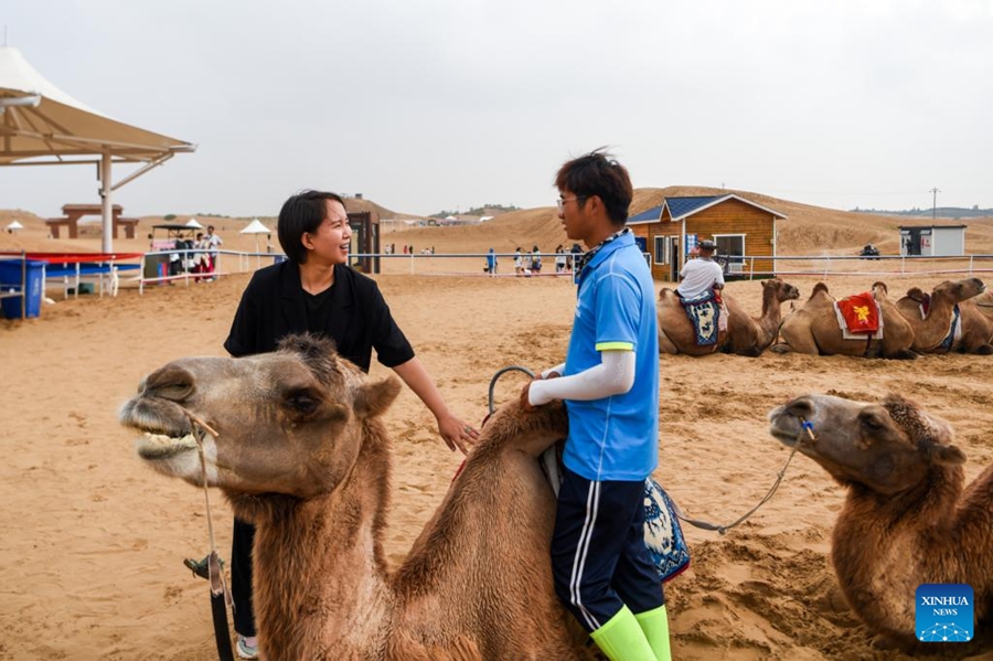 | Li Fang berbual dengan rakannya di kawasan pemandangan Padang Pasir Yinkentala di Dalad Banner, Wilayah Autonomi Mongolia Dalam China pada 31 Julai 2024.(Xinhua/Li Zhipeng) |
