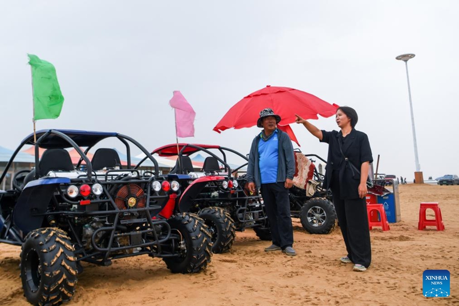 | Li Fang berkomunikasi dengan penduduk kampung yang menjalankan perniagaan sewa kenderaan luar jalannraya di kawasan pemandangan Padang Pasir Yinkentala di Dalad Banner, Wilayah Autonomi Mongolia Dalam China pada 31 Julai 2024.(Xinhua/Li Zhipeng) |