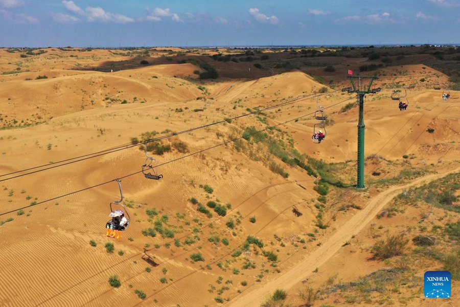 | Foto sudut udara ini memaparkan pelancong yang sedang menaiki kereta kabel di kawasan pemandangan Padang Pasir Yinkentala di Dalad Banner, Wilayah Autonomi Mongolia Dalam di utara China pada 31 Julai 2024. (Xinhua/Li Zhipeng) |