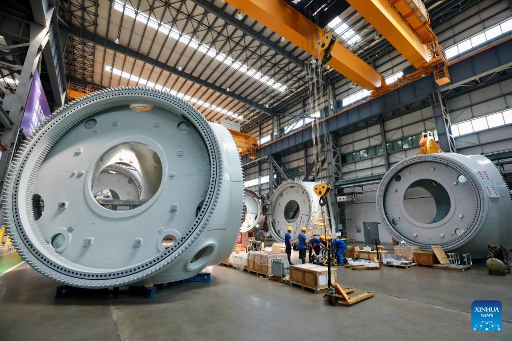 | Para pekerja di Syarikat Kuasa Angin Elektrik Dongfang sedang menghasilkan turbin angin luar pesisir 18 megawat di Taman Perindustrian Kuasa Angin Luar Pesisir Tiga Gaung Fujian di Bandar Fuqing, Provinsi Fujian, tenggara China pada 8 Ogos 2024. Taman Perindustrian dengan jumlah pelaburan sehingga RMB4 bilion (RM2.48 bilion) tersebut merupakan taman perindustrian kuasa angin luar pesisir rantaian industri penuh pertama di China. (Xinhua/Jiang Kehong) |