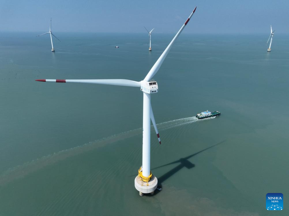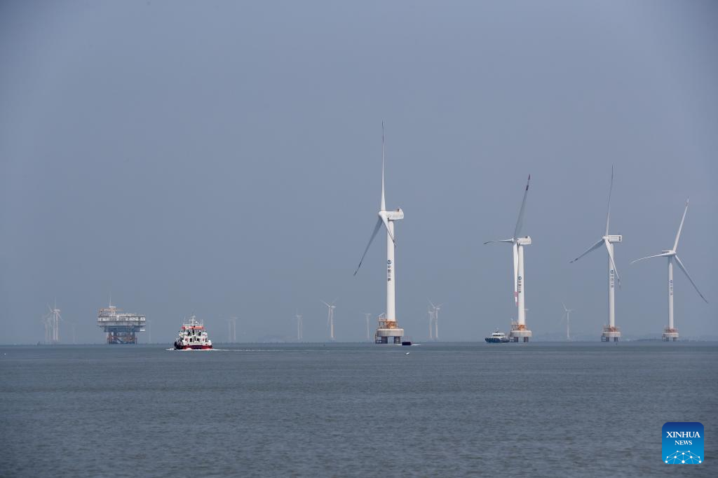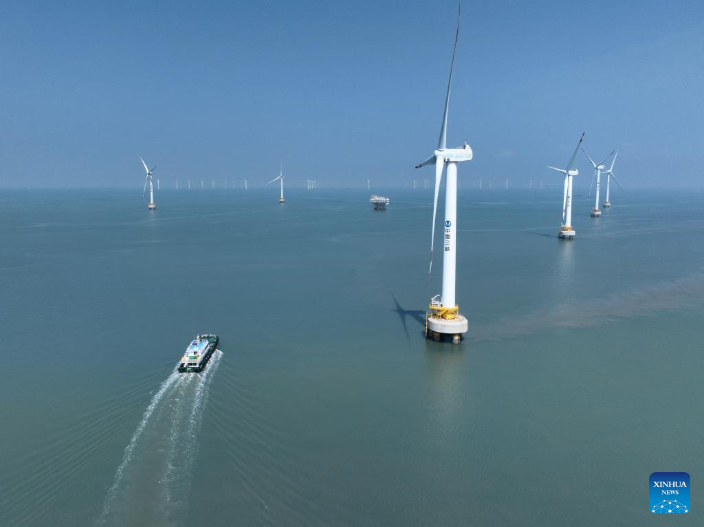 | Foto sudut udara yang diambil pada 8 Ogos 2024 ini memaparkan loji angin Teluk Xinghua, iaitu tempat terhasilnya beberapa turbin angin luar pesisir di Taman Perindustrian Kuasa Angin Luar Pesisir Tiga Gaung Fujian yang dipasang di Bandar Fuqing, Provinsi Fujian, tenggara China. Taman Perindustrian dengan jumlah pelaburan sehingga RMB4 bilion (RM2.48 bilion) tersebut merupakan taman perindustrian kuasa angin luar pesisir rantaian industri penuh pertama di China. (Xinhua/Jiang Kehong) |