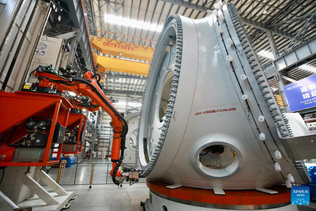 | Lengan robotik menghasilkan turbin angin luar pesisir 18 megawat di Syarikat Kuasa Angin Elektrik Dongfang sedang menghasilkan turbin angin luar pesisir 18 megawat di Taman Perindustrian Kuasa Angin Luar Pesisir Tiga Gaung Fujian di Bandar Fuqing, Provinsi Fujian, tenggara China pada 8 Ogos 2024. Taman Perindustrian dengan jumlah pelaburan sehingga RMB4 bilion (RM2.48 bilion) tersebut merupakan taman perindustrian kuasa angin luar pesisir rantaian industri penuh pertama di China. (Xinhua/Jiang Kehong) |