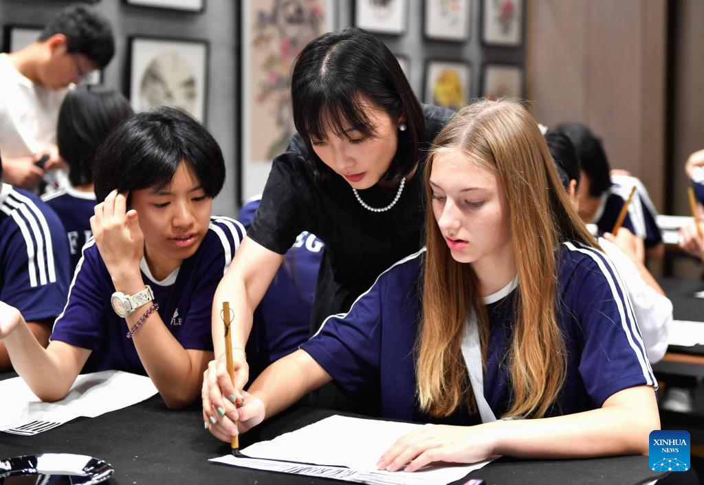 | Seorang guru menunjukkan kepada pelajar dari Amerika untuk membuat kaligrafi semasa acara kebudayaan di Shijiazhuang Foreign Language School, di Provinsi Hebei, utara China pada 10 Ogos 2024. Satu delegasi yang terdiri daripada pelajar dan guru sekolah menengah dari negeri Iowa, Amerika Syarikat mengambil bahagian dalam acara kebudayaan sempena Pesta Qixi yang turut dikenali sebagai Hari Valentine China. (Xinhua/Wang Xiao) |