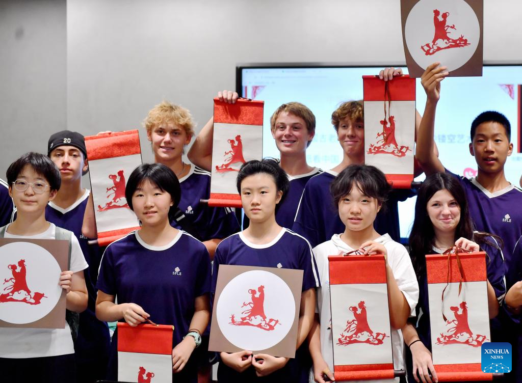 | Pelajar China dan Amerika menunjukkan hasil guntingan kertas masing-masing yang menampilkan Pesta Qixi semasa acara kebudayaan di Shijiazhuang Foreign Language School, di Provinsi Hebei, utara China pada 10 Ogos 2024. Satu delegasi yang terdiri daripada pelajar dan guru sekolah menengah dari negeri Iowa, Amerika Syarikat mengambil bahagian dalam acara kebudayaan sempena Pesta Qixi yang turut dikenali sebagai Hari Valentine China. (Xinhua/Wang Xiao) |