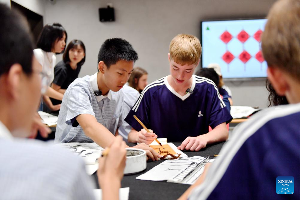| Pelajar China dan Amerika mencuba kaligrafi semasa acara kebudayaan di Shijiazhuang Foreign Language School, di Provinsi Hebei, utara China pada 10 Ogos 2024. Satu delegasi yang terdiri daripada pelajar dan guru sekolah menengah dari negeri Iowa, Amerika Syarikat mengambil bahagian dalam acara kebudayaan sempena Pesta Qixi yang turut dikenali sebagai Hari Valentine China. (Xinhua/Wang Xiao) |