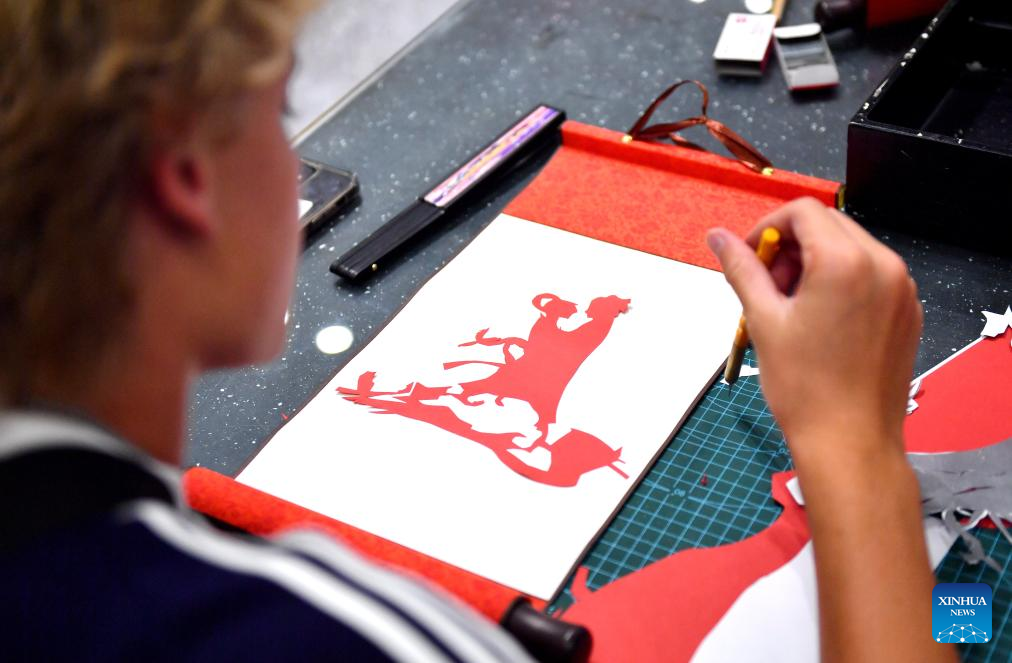 | Seorang pelajar Amerika membuat seni guntingan kertas yang menampilkan Pesta Qixi semasa acara kebudayaan di Shijiazhuang Foreign Language School, di Provinsi Hebei, utara China pada 10 Ogos 2024. Satu delegasi yang terdiri daripada pelajar dan guru sekolah menengah dari negeri Iowa, Amerika Syarikat mengambil bahagian dalam acara kebudayaan sempena Pesta Qixi yang turut dikenali sebagai Hari Valentine China. (Xinhua/Wang Xiao) |