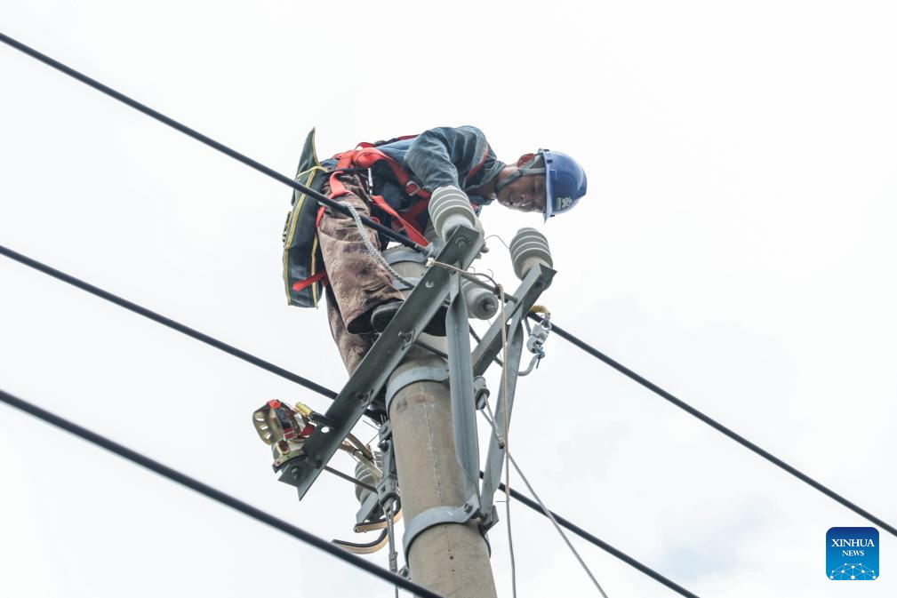 | Seorang petugas syarikat tenaga dari Provinsi Hunan membaiki kemudahan elektrik di Bandar Changsa di Wenchang, Provinsi Hainan pada 9 September 2024. (Xinhua/Zhang Liyun) |