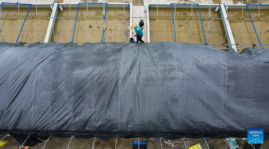 | Foto dron ini menunjukkan kakitangan memasang siling sebuah kilang udang goreng di Wenchang, provinsi Hainan, selatan China, 10 September 2024. (Xinhua/Yang Guanyu) |