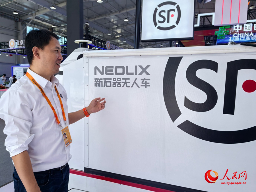 | Petugas dari Syarikat SF Express sedang memperincikan tentang kenderaan penghantaran tanpa pemandu. (People’s Daily Online/Yang Chunyan) |