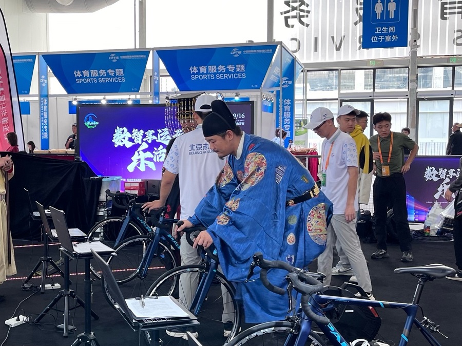 | Seorang pengunjung mencuba menggunakan basikal kegunaan tertutup sambil memakai baju tradisional semasa Pameran Antarabangsa China untuk Perdagangan Perkhidmatan (CIFTIS) 2024 di Pusat Konvensyen dan Pameran Antarabangsa Shougang. (People’s Daily Online/Ahmad Syukri) |