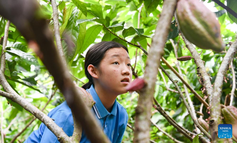 | Seorang pelajar mendekati buah koko di Taman Botani Tropika Xinglong di Bandar Wanning, Provinsi Hainan pada 22 September 2024. Aktiviti popularisasi sains yang memfokuskan terhadap koko telah diadakan pada Ahad oleh Institut Penyelidikan Rempah dan Minuman di bawah Akademi Sains Pertanian Tropika China. (Xinhua/Yang Guanyu) |