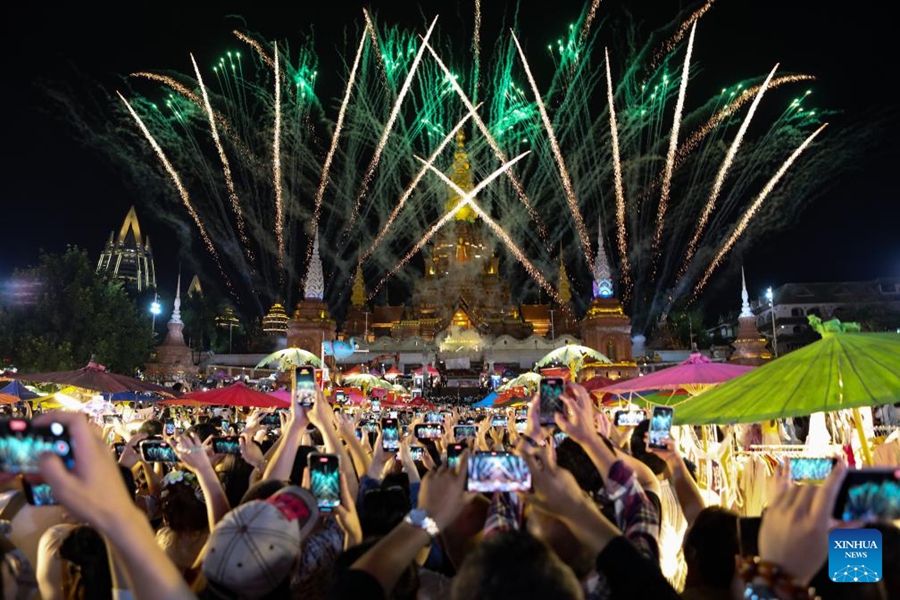 | Orang ramai menikmati pertunjukan bunga api di bandar Jinghong, kawasan autonomi Dai Xishuangbanna, provinsi Yunnan, barat daya China, 4 Oktober 2024. (Foto oleh Li Yunsheng/Xinhua) |
