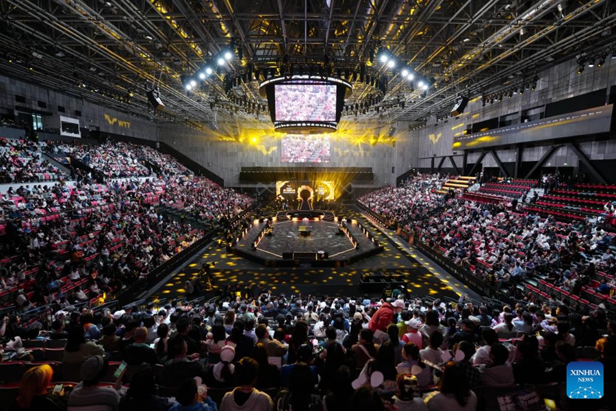 | Orang ramai menonton pertandingan World Table Tennis (WTT) China Smash 2024 di Taman Shougang, Beijing, 3 Oktober 2024. (Foto oleh Zhang Chenlin/Xinhua) |