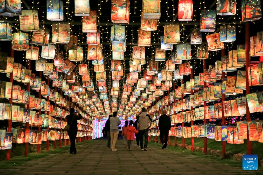 | Pengunjung menikmati pertunjukan cahaya di bandar Yuhuan, provinsi Zhejiang, timur China, 4 Oktober 2024. (Foto oleh Duan Junli/Xinhua) |
