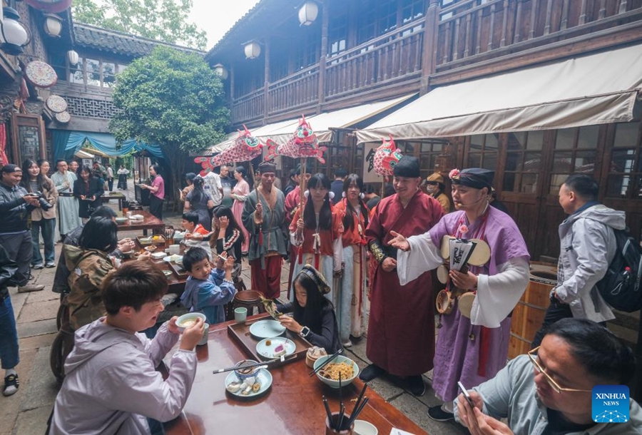 | Kakitangan berpakaian tradisional berinteraksi dengan pengunjung di Resort Fesyen Puyuan, bandar Tongxiang, provinsi Zhejiang, timur China, 5 Oktober 2024. (Foto oleh Xu Yu/Xinhua) |