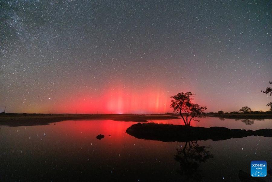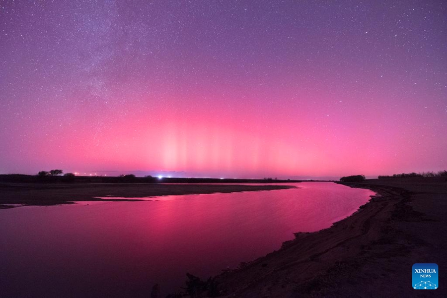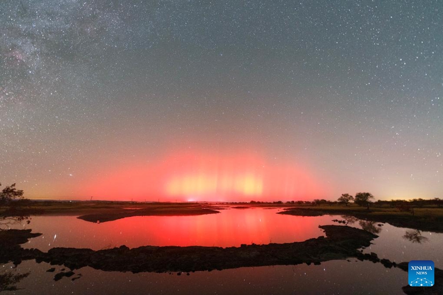 | Foto bertarikh 11 Oktober 2024 ini menunjukkan fenomena cahaya utara di sebuah tanah lembap di bandar Harbin, provinsi Heilongjiang, timur laut China. (Foto oleh Liu Dapeng/Xinhua) |