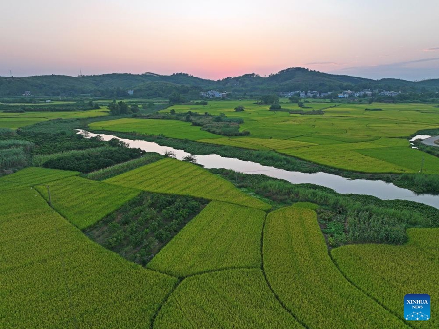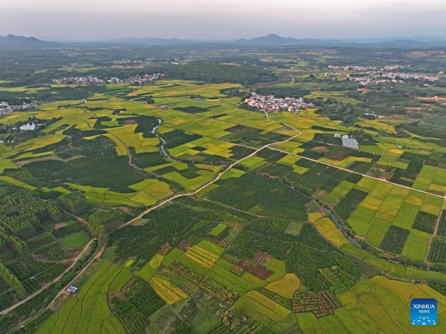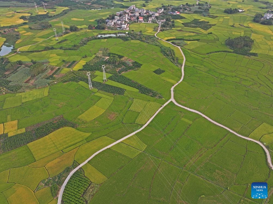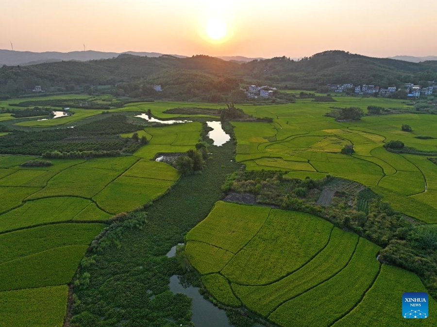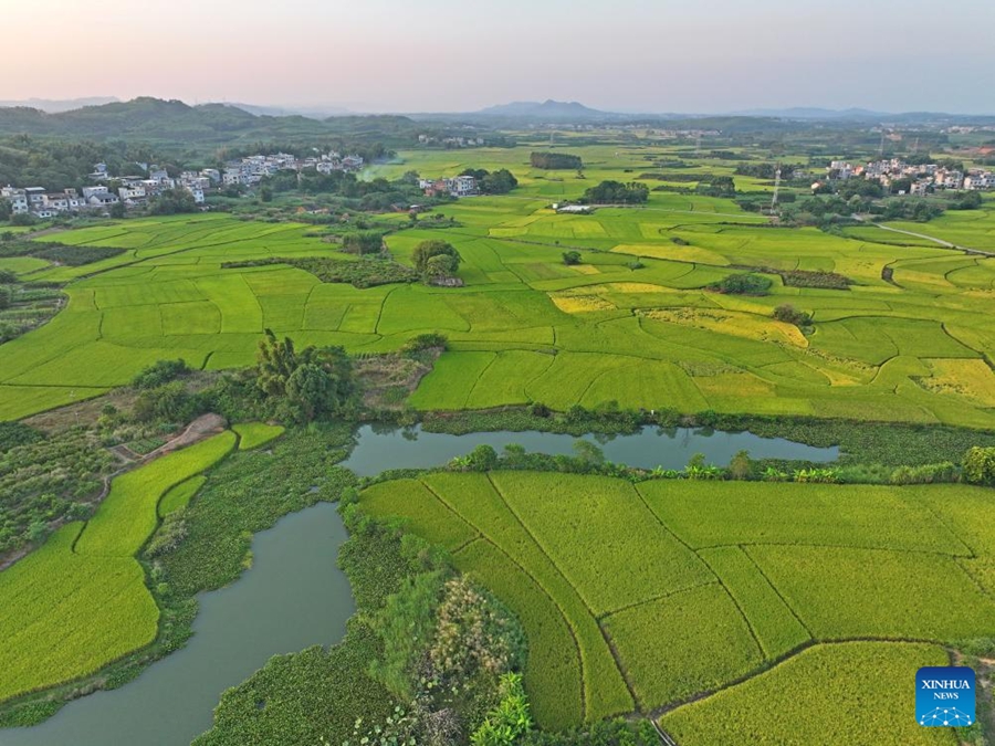 | Foto dron bertarikh 10 Oktober 2024 ini menunjukkan tanah-tanah ladang di pekan Sicun, kaunti Xiangzhou, bandar Laibin, Wilayah Autonomi Zhuang Guangxi, selatan China. (Xinhua/Zhou Hua)   |