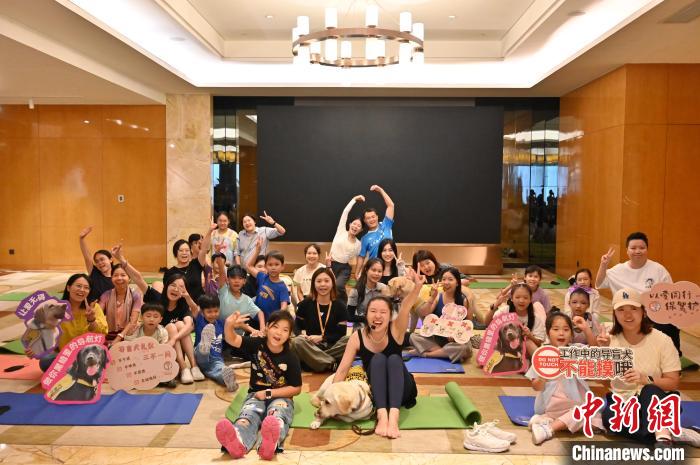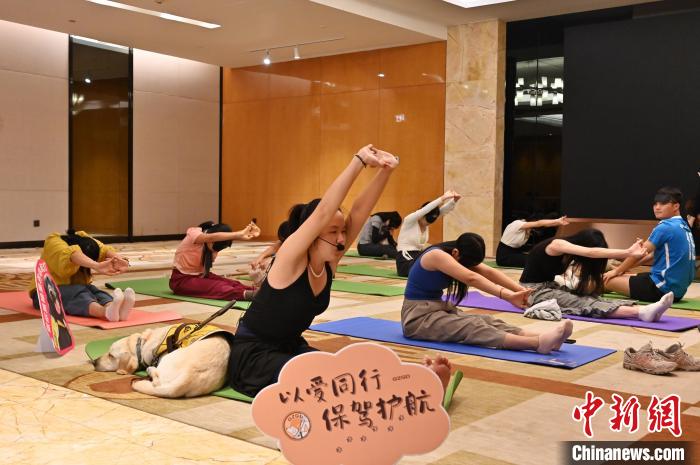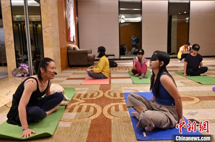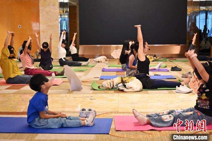 | Pengguna anjing pemandu, Xiao Jia (paling kiri) membimbing kelas yoga, memberikan para peserta pengalaman melakukan senaman yoga menggunakan penutup mata. Foto oleh Chen Chuhong, wartawan China News Service |