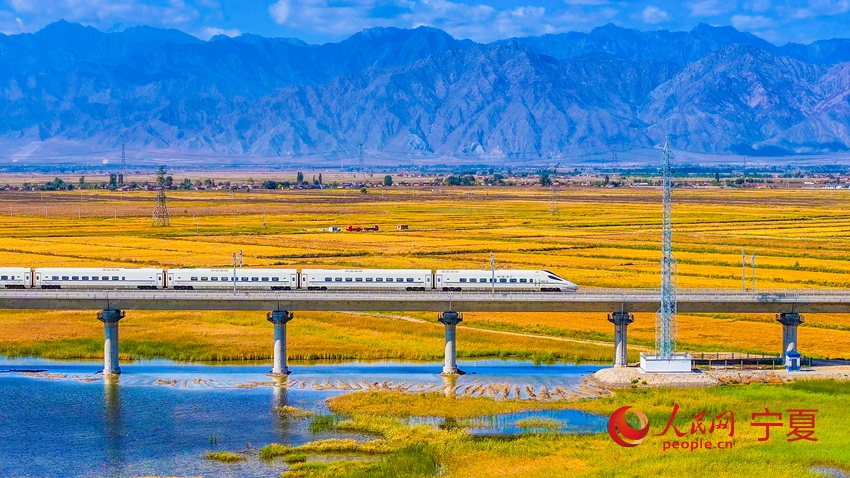 | Kereta api laju melalui tanah ladang kuning keemasan di kaki Pergunungan Helan di Wilayah Autonomi Hui Ningxia, barat laut China. (People’s Daily Online/Liang Hongxin) |