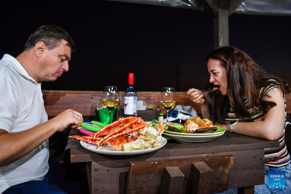 | Orang ramai menikmati ketam raja di sebuah restoran di Vladivostok, Rusia, 2 September 2024. (Foto/Xinhua) |