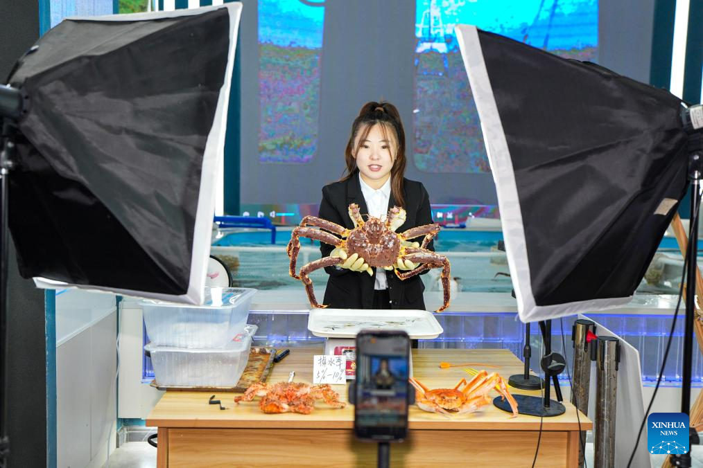 | Seorang kakitangan mempromosikan ketam raja melalui penstriman langsung di sebuah kedai di Hunchun, Provinsi Jilin, timur laut China, 20 September 2024. (Foto/Xinhua) |