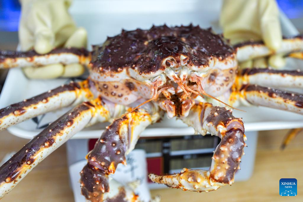 | Foto yang diambil pada 20 September 2024 ini menunjukkan ketam raja di sebuah kedai di Taman Perindustrian E-dagang Rentas Sempadan Asia Timur Laut, di Hunchun, Provinsi Jilin di timur laut China. (Foto/Xinhua) |