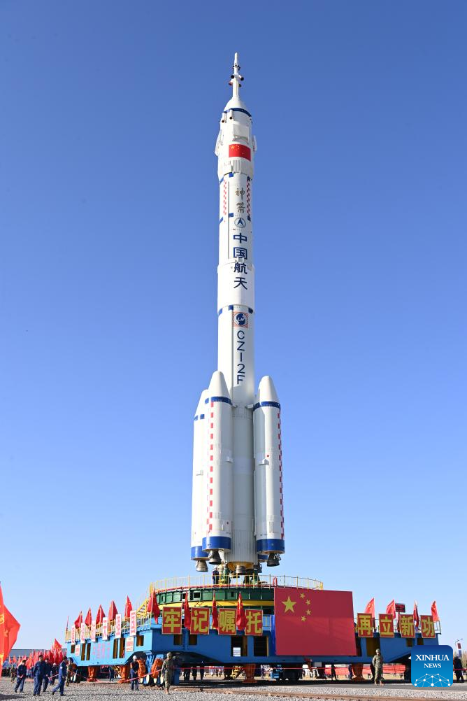 | Foto bertarikh 22 Oktober 2024 ini menunjukkan gabungan kapal angkasa berawak Shenzhou-19 dan roket pembawa Long March-2F dipindahkan ke kawasan pelancaran. (Wang Jiangbo/Xinhua) |