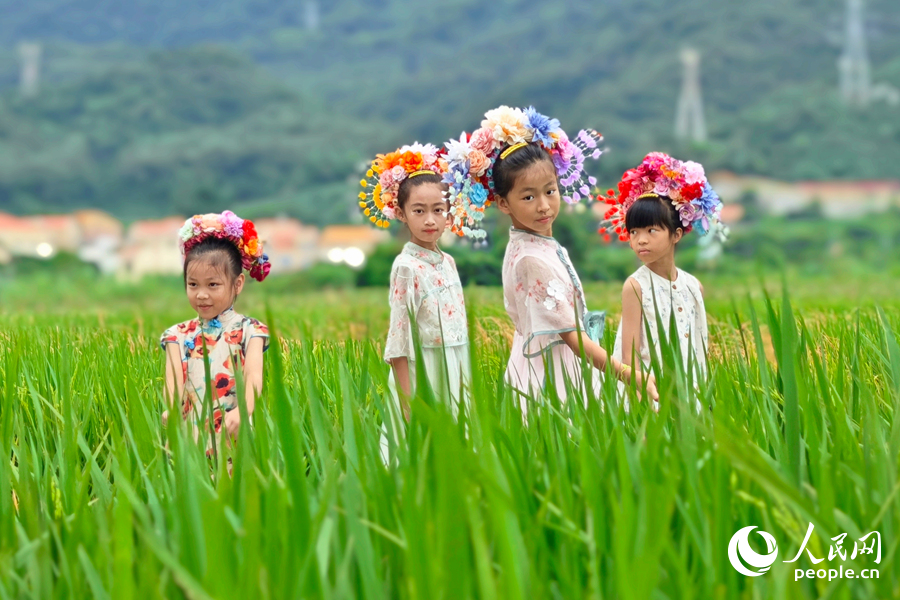 | Foto kanak-kanak perempuan dengan memakai pin rambut bunga berjalan-jalan di sekitar sawah padi di kampung Tiantou, daerah Jimei, bandar Xiamen, Provinsi Fujian, tenggara China. (People’s Daily Online/Chen Bo) |