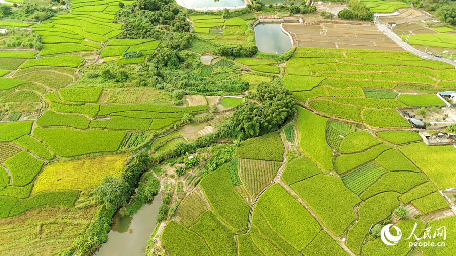 | Pemandangan udara sawah padi pelbagai warnai, tidak ubah seperti palet warna di kampung Tiantou, daerah Jimei, bandar Xiamen, Provinsi Fujian, tenggara China. (People’s Daily Online/Chen Bo) |