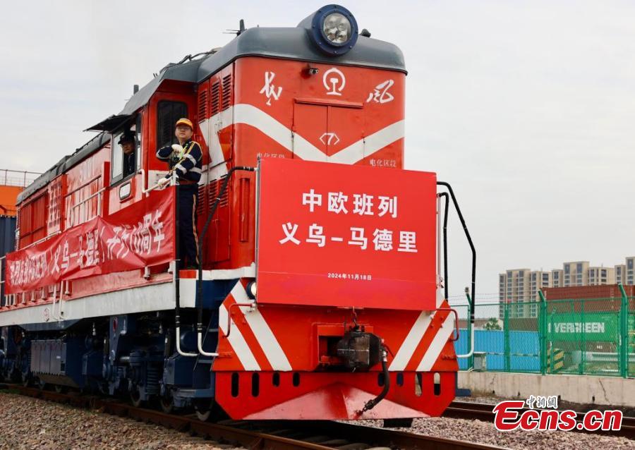 | Sebuah kereta api kargo yang dimuatkan dengan barangan eksport dari Yiwu, Provinsi Zhejiang di timur China menuju ke Madrid, Sepanyol pada 18 November 2024. (Foto China News Service/Dong Yixin) |