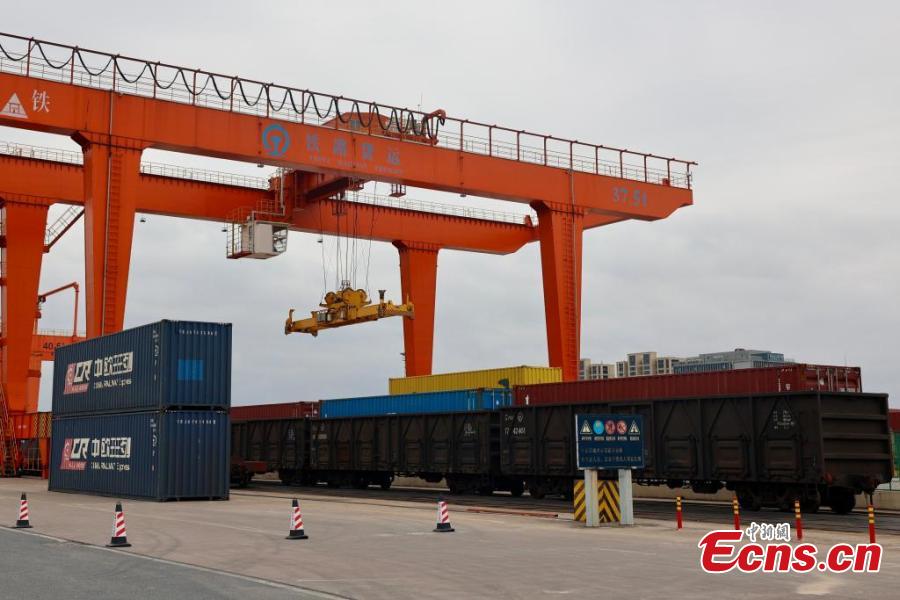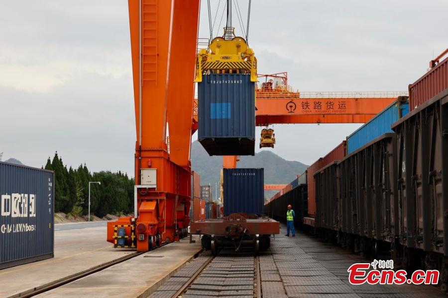 | Kontena dimasukkan ke dalam kereta api kargo di Stesen Kereta Api Barat Yiwu, Provinsi Zhejiang di timur China, pada 18 November 2024. (Foto China News Service/Dong Yixin) |