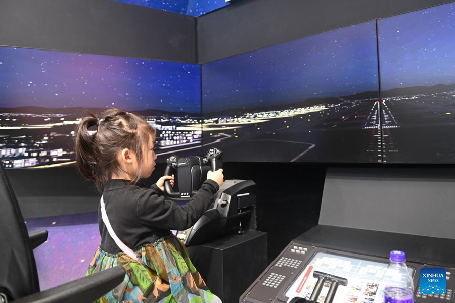 | Foto ini memperlihatkan seorang kanak-kanak perempuan sedang mencuba simulator penerbangan digital. (Xinhua/Huang Zongzhi) |