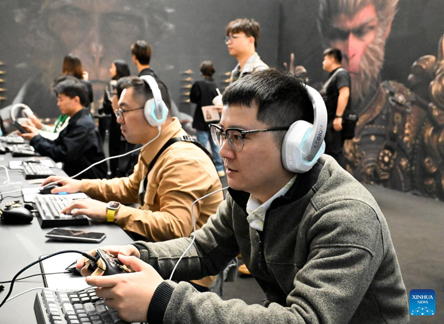 | Foto ini aksi pengunjung yang mencuba sendiri permainan video ‘Black Myth” Wukong. (Xinhua/Cai Xiangxin) |